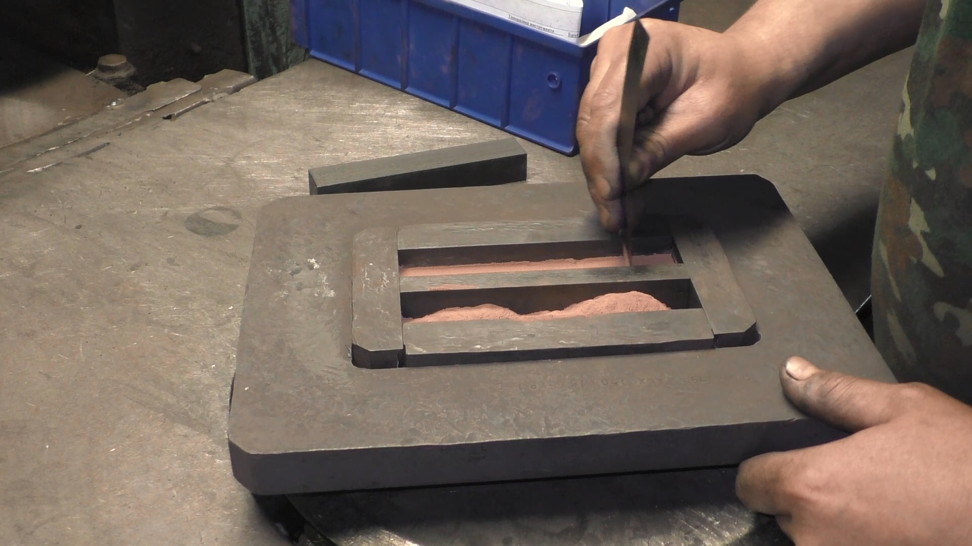 В собранную оснастку высыпаем подготовленную шихту. Оснастка рассчитана на одновременное производство двух заготовок. На этом этапе очень важно качественно разровнять шихту внутри оснастки, это необходимо для придания равномерной твердости и распределения всех элементов внутри изделия. Хочу уточнить один момент. Под каждое зерно у нас своя оснастка! Это не позволяет допустить паразитных зерен в нашем изделии.