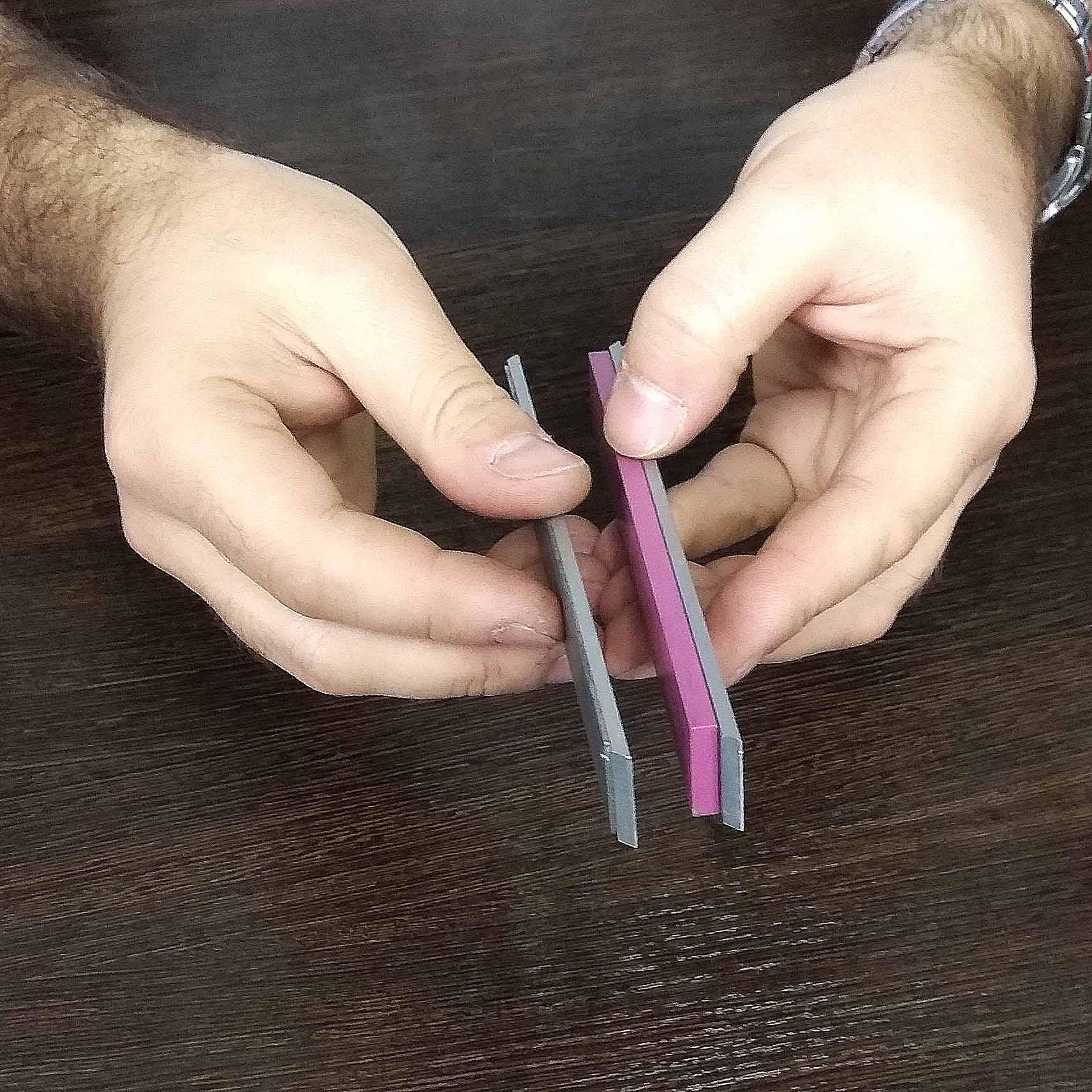 Решением этой задачи на точилке ЖУК является вставка 130 мм, она имеет большую длину в отличие от базовой вставки 80 мм и обеспечивает большую площадь прилегания, а пятно контакта магнита с ножом равномерно распределено по плоскости клинка. За счет увеличенной длины и расстояния между магнитами, этот столик подойдет для заточки мягких гнущихся клинков кухонных и охотничьих ножей от 140 мм.