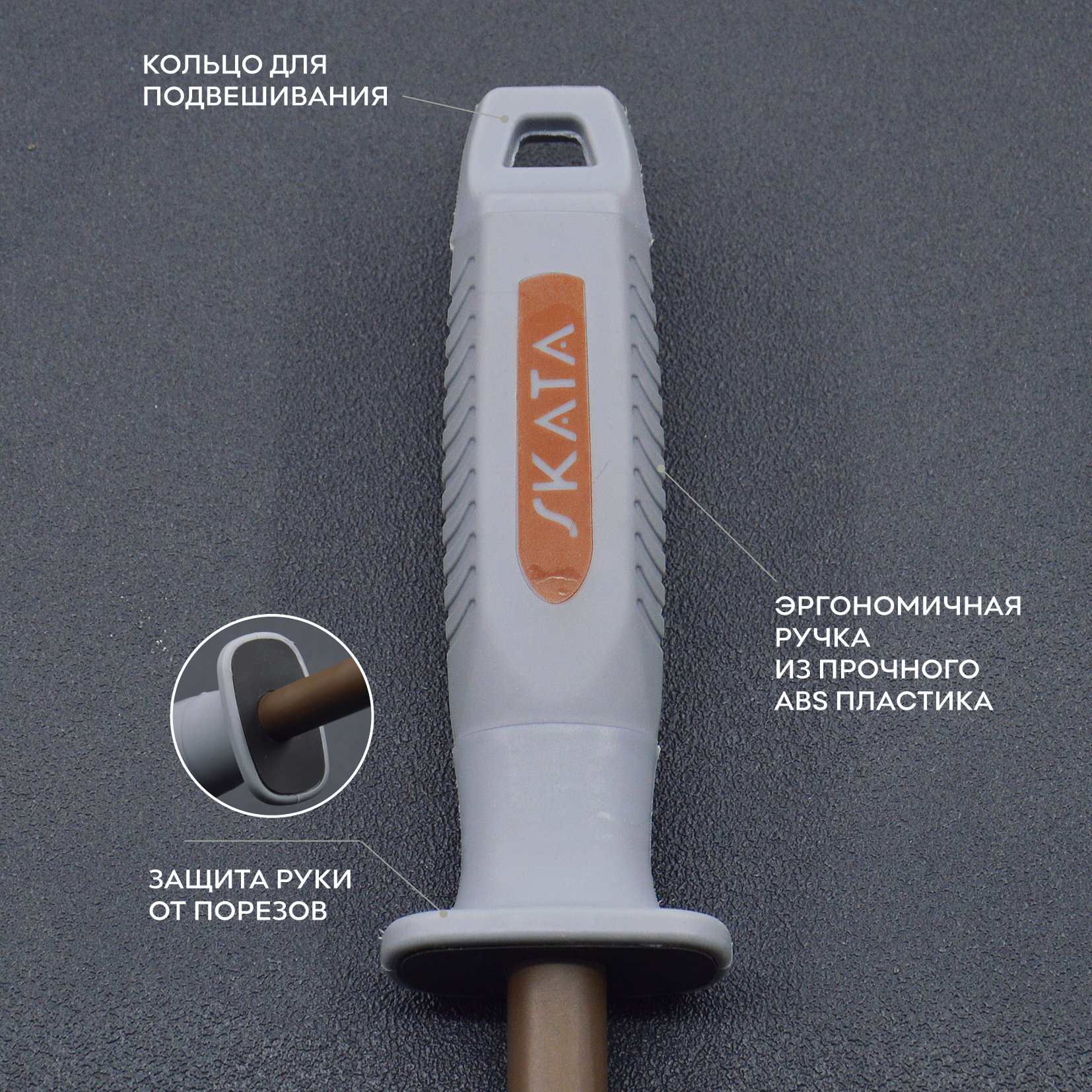 Мусат SKATA оснащён удобной эргономичной прорезиненной рукояткой - он отлично лежит в руке и позволяет удобно работать с ножами любого вида.