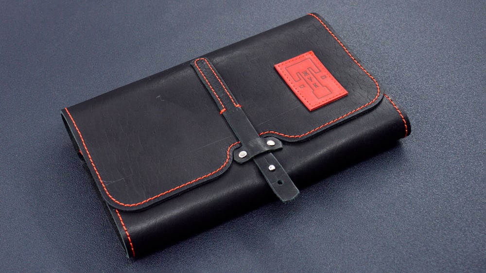 Сумка складывается пополам и закрывается клапаном. На клапане размещена нашивка с фирменным логотипом. В качестве замка используется «кобурная застежка». Для придания завершенного вида, по периметру, сумка прошита красной нитью.